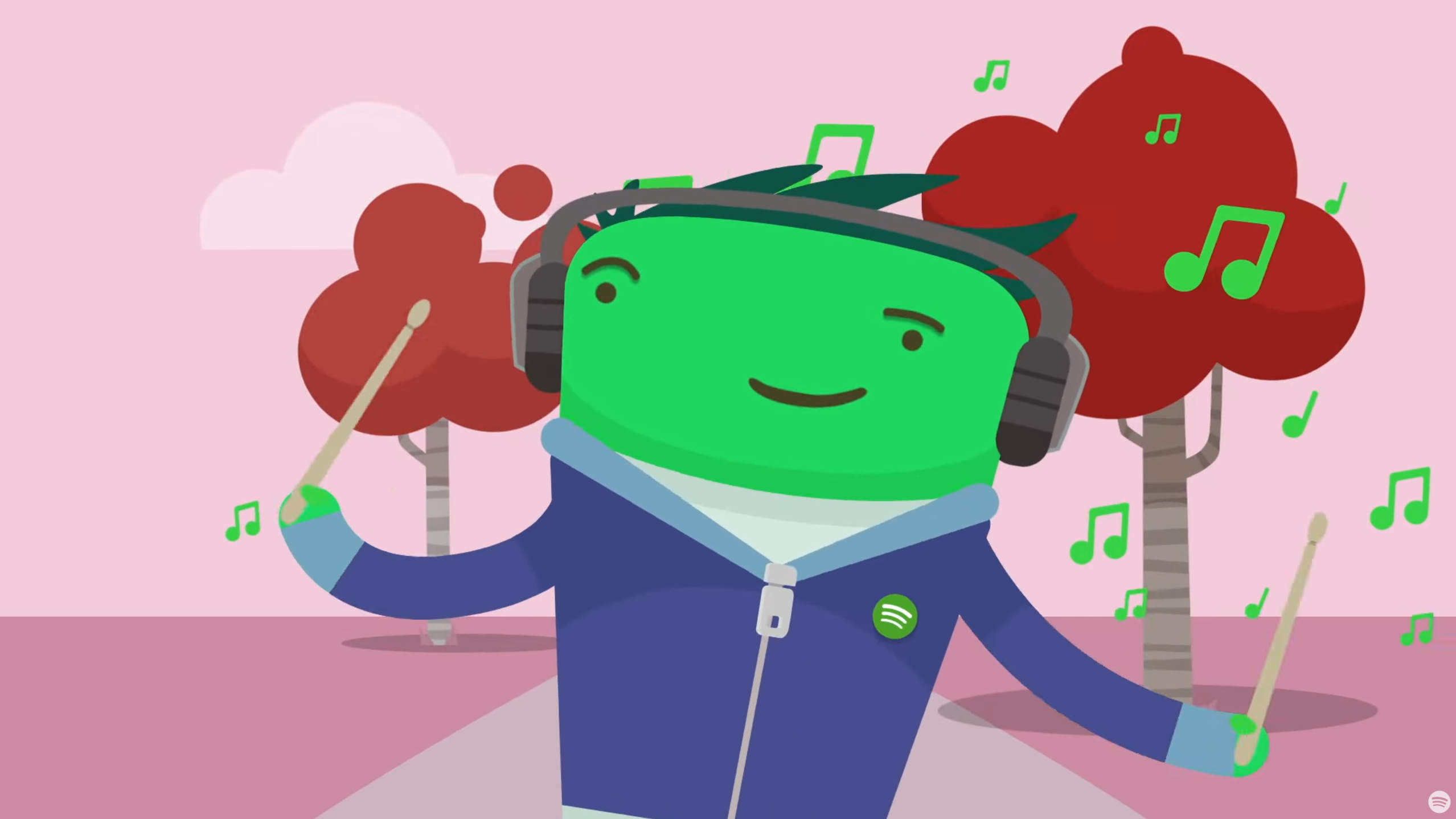 Character animation featuring the green mascot enjoying music with headphones, showcasing the playful illustration style of the campaign